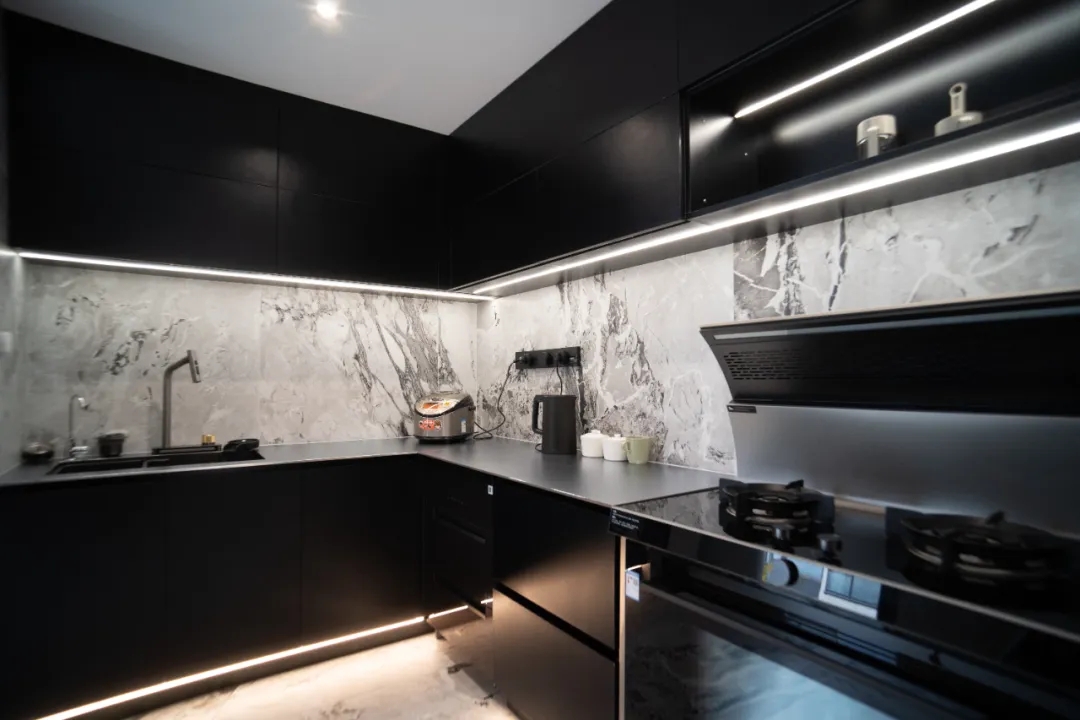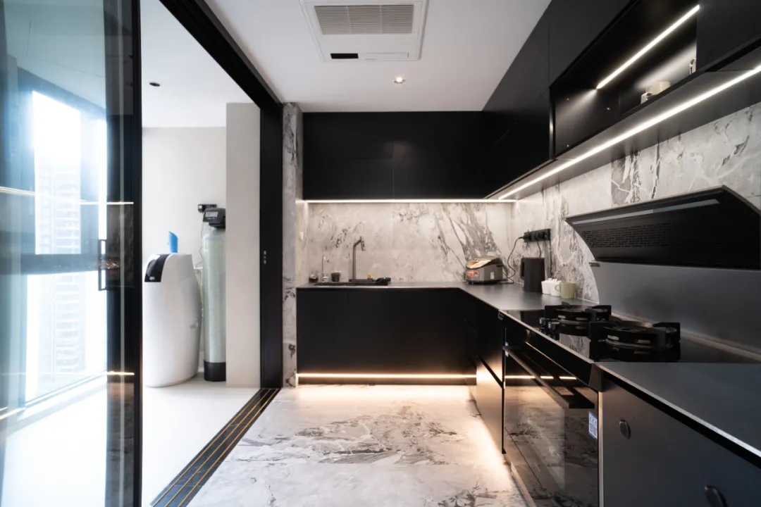 空間深諳色彩對比的樂趣,經典優(yōu)雅的灰白色系中,一抹橘紅調如冬日的火苗,瞬間點燃空間的熱情和溫度。自然光源與人造光源結合,激活空間的溫馨愜意感,自然形成的光影如動人的樂曲直達心底。