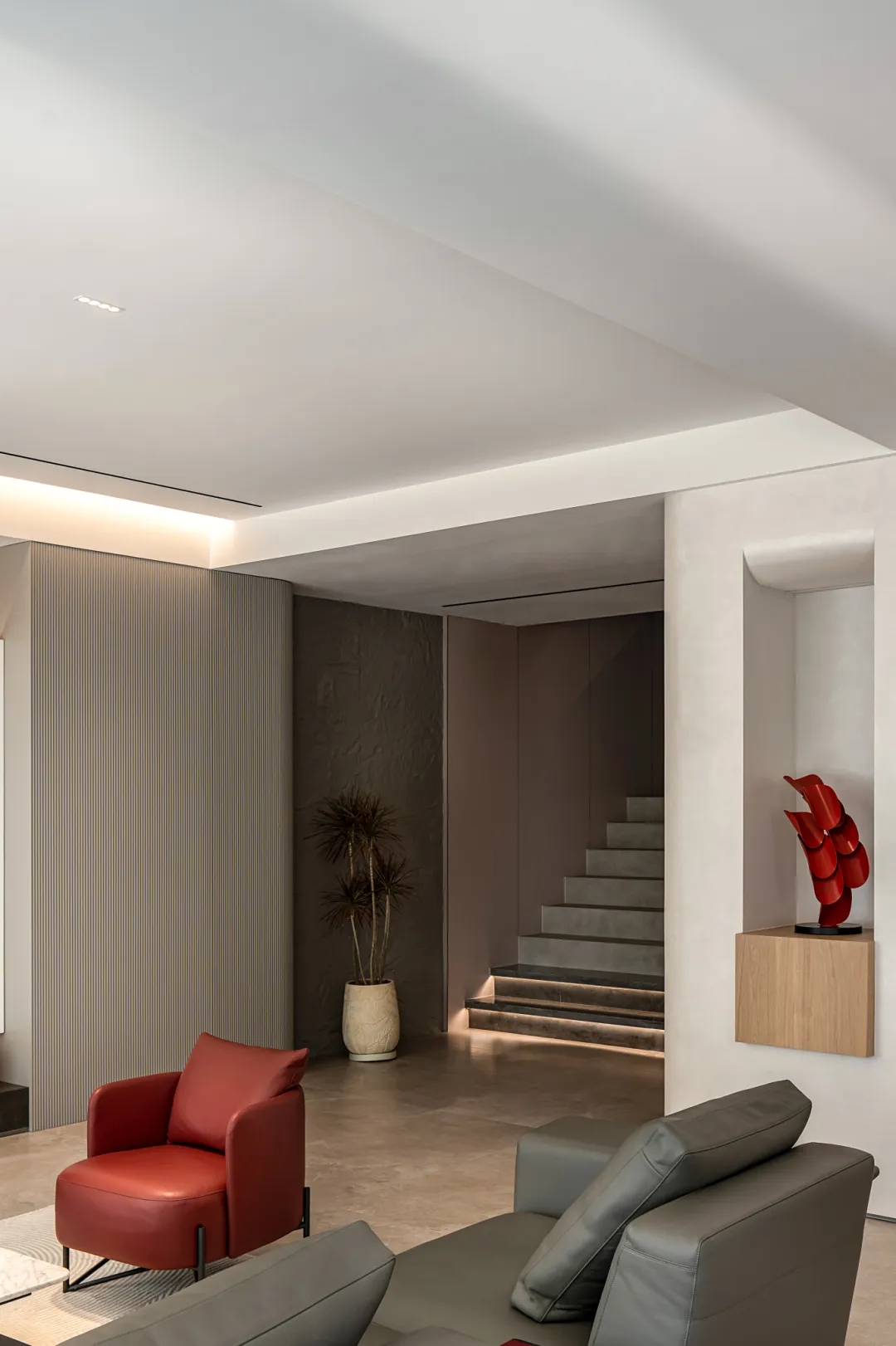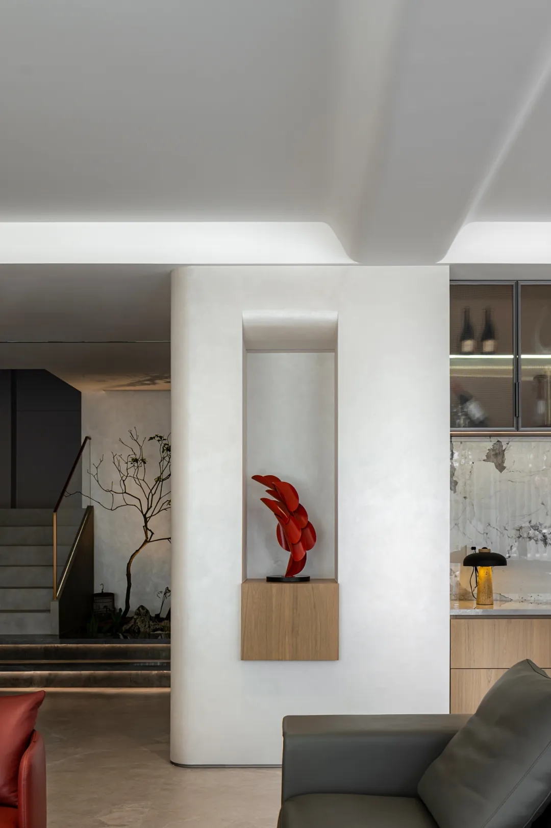樓梯一隅由光、影、景、物等自然手法,來(lái)營(yíng)造空間的豐富層次,構(gòu)建出一處悠然天地。