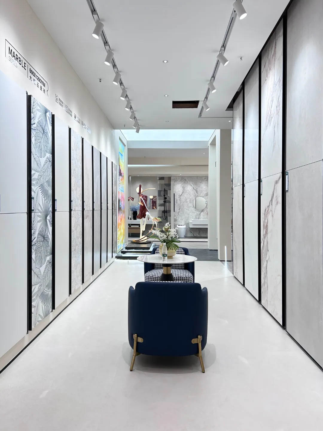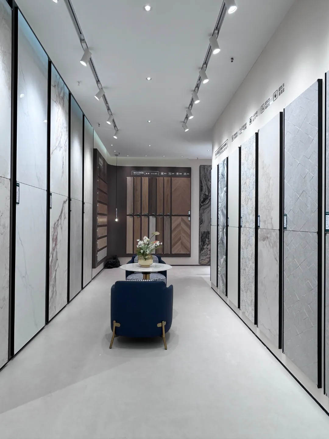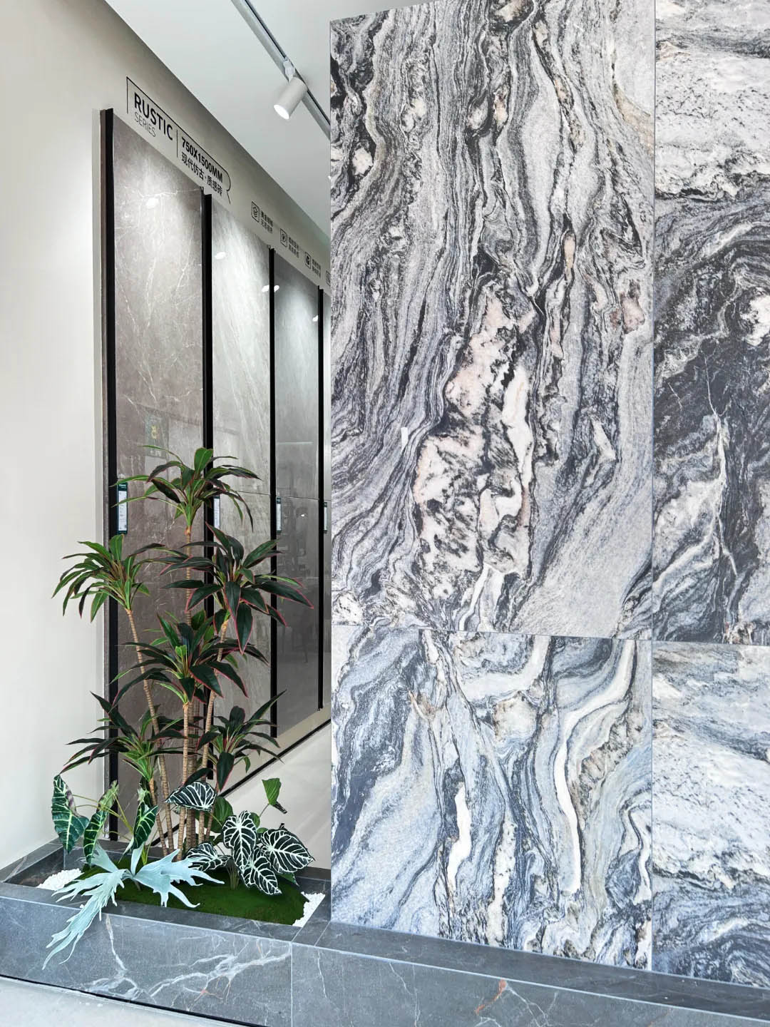 視覺(jué)墻采用900x1800mm翡冷翠彩石,粗曠豪邁的紋理,述說(shuō)著大自然的磅礴之美,與之形成鮮明對(duì)比的是從切面空間到直線的選材區(qū)轉(zhuǎn)變,讓瀏覽動(dòng)線更加豐富。